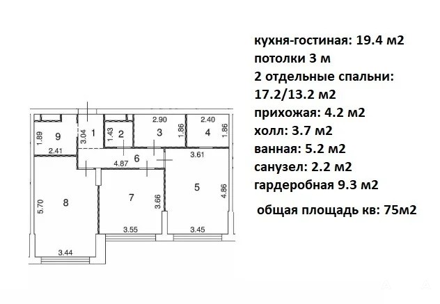 - 2 отдельные спальни: 17.2/13.2 м2