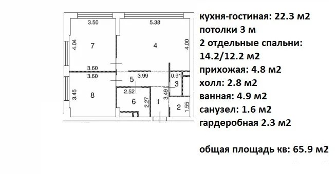 - 2 отдельные спальни: 14.2/12.2 м2
