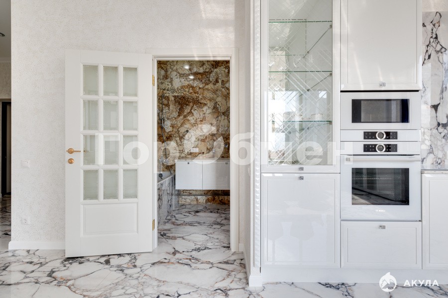 В отделке использованы: фактурная штукатурка с золотом ручной работы(стены), крупноформатный керамогранит с дизайном мрамор, натуральный камень кварц и мрамор, межкомнатные двери из массива ольхи, премиальные хрустальные люстры из Италии и многое другое.