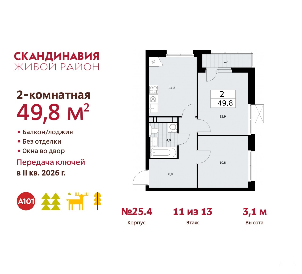 2-комн. квартира бизнес-класса в ЖК "Скандинавия" на 11 этаже. Квартира без отделки, полностью готова к чистовой отделке и дальнейшему ремонту. Общая площадь: 49.8 кв.м., жилая: 23.7 кв.м., площадь просторной кухни-столовой: 11.8 кв.м. Угловая квартира, идеально подойдет любителям тишины и панорамных видов. В квартире одна лоджия, один совмещенный санузел. Высота потолков 3.1 м.