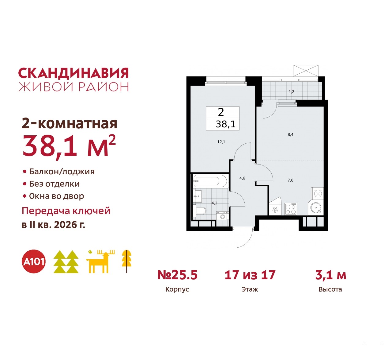 Продается двухкомнатная квартира бизнес-класса с европланировкой в ЖК "Скандинавия" на 17 этаже. Квартира без отделки, полностью готова к чистовой отделке и дальнейшему ремонту. Общая площадь: 38.1 кв.м., жилая: 20.5 кв.м., общая площадь гостиной-столовой с кухонной зоной: 16.0 кв.м. Европланировка, зона гостиной комнаты объединена с кухней. Комнаты изолированные, все окна выходят на одну сторону. В квартире одна лоджия, один совмещенный санузел. Высота потолков 3.1 м.