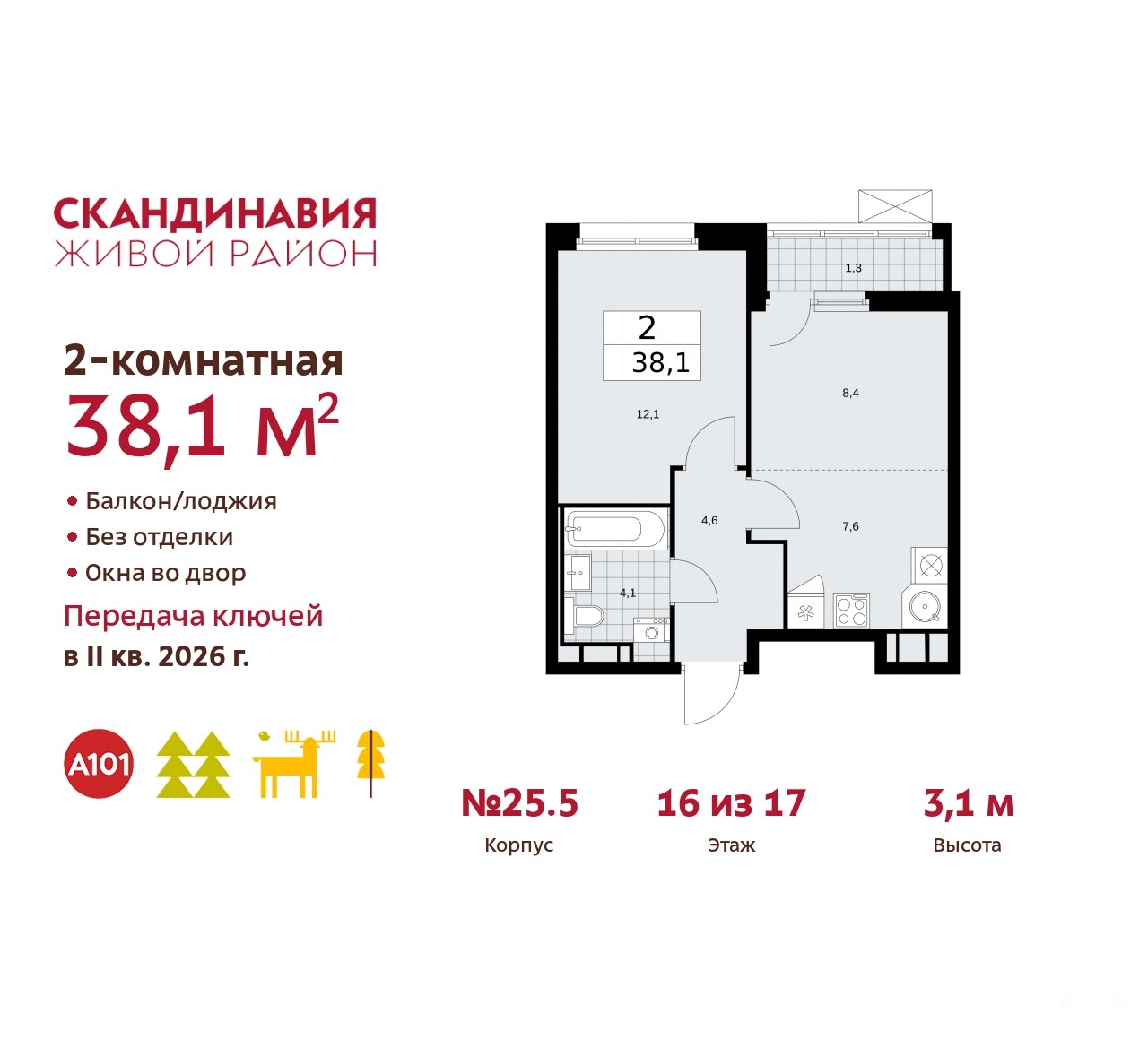 Просторная двухкомнатная квартира бизнес-класса с европланировкой в ЖК "Скандинавия" на 16 этаже. Квартира без отделки, после выдачи ключей можно делать ремонт. Общая площадь: 38.1 кв.м., жилая: 20.5 кв.м., суммарная площадь гостиной-столовой с кухонной зоной: 16.0 кв.м. Европейская планировка, за счет большой площади кухни-гостиной квартира выглядит просторной и очень удобна для жизни. Комнаты изолированные, все окна выходят на одну сторону. В квартире одна лоджия, один совмещенный санузел. Высота потолков 3.1 м.