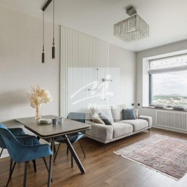 №174822 Стильная и современная квартира площадью 65, 5 кв. м. Особенности квартиры: прекрасный панорамный вид, будущие владельцы смогут наслаждаться видами на строящуюся ледовую арену (открытие запланировано на 2026 год), величественный Триумф-Палас,...