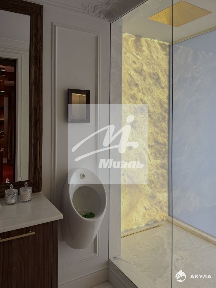 Мраморная стена душевой подсвечивается перекликаясь с фартуком кухни, создавая единый дизайнерский ритм по всей квартире.