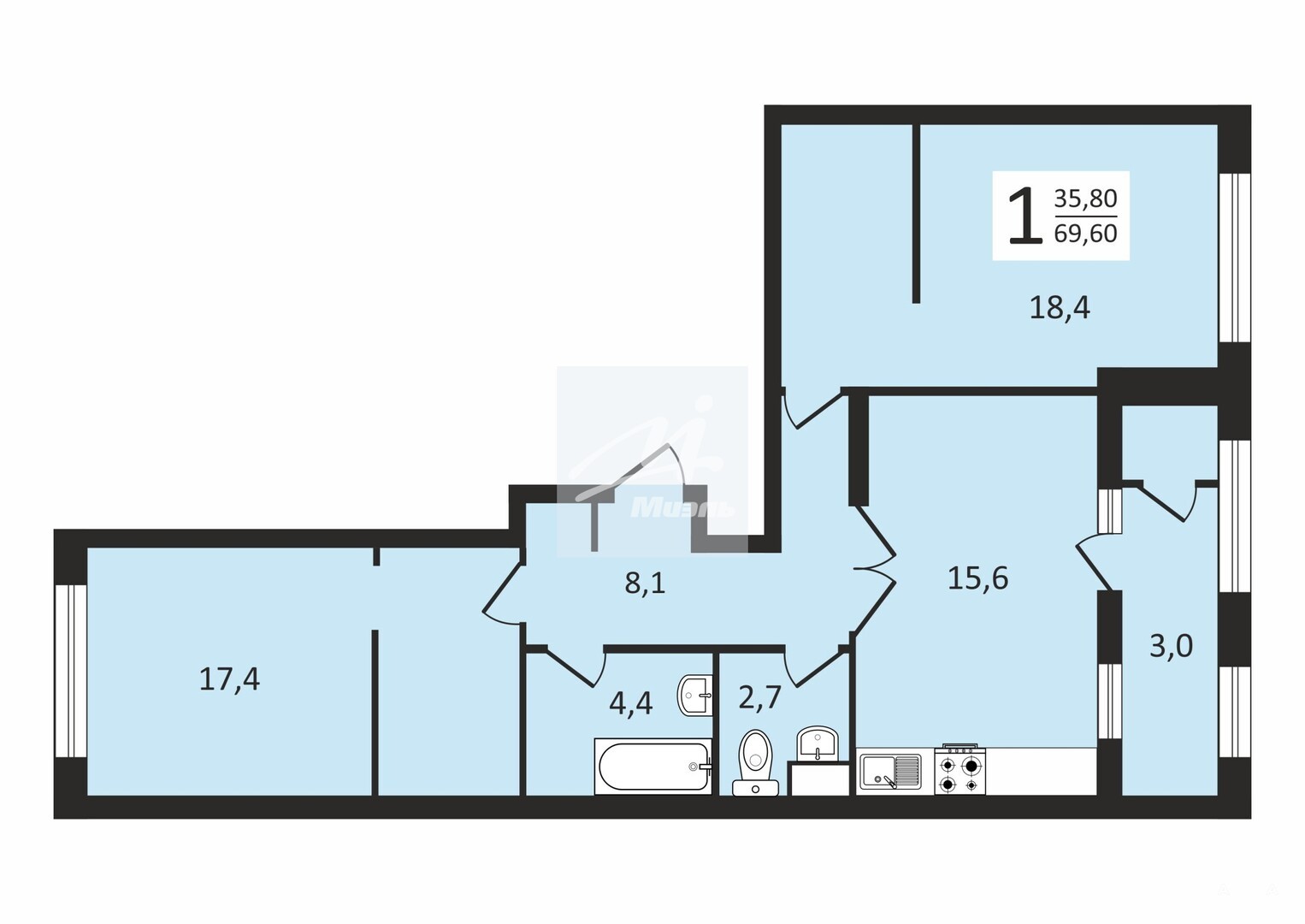 раздельный санузел с большой ванной комнатой 4, 4 кв.м. удобно для семьи