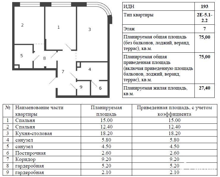 Две гардеробных комнаты - 5, 2м2 и 2, 1м2.