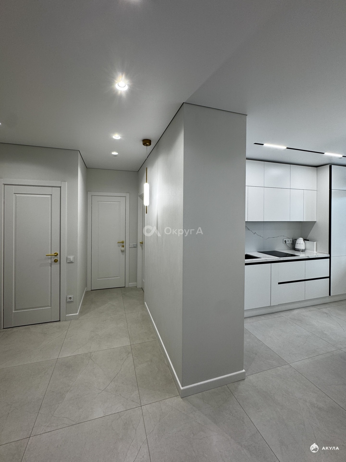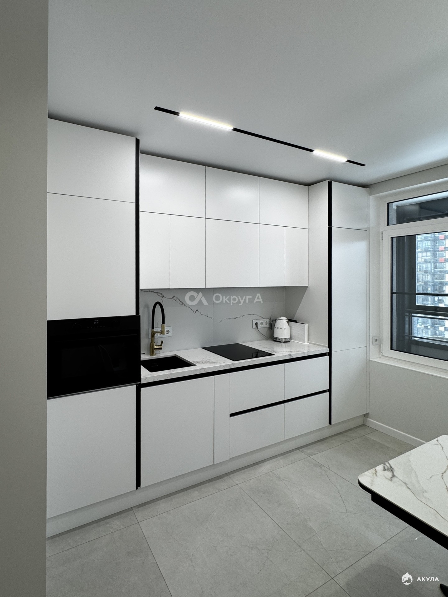 * Потолок по всей квартире с теневым профилем еврокраб, индивидуальное освещение Denkirs;
