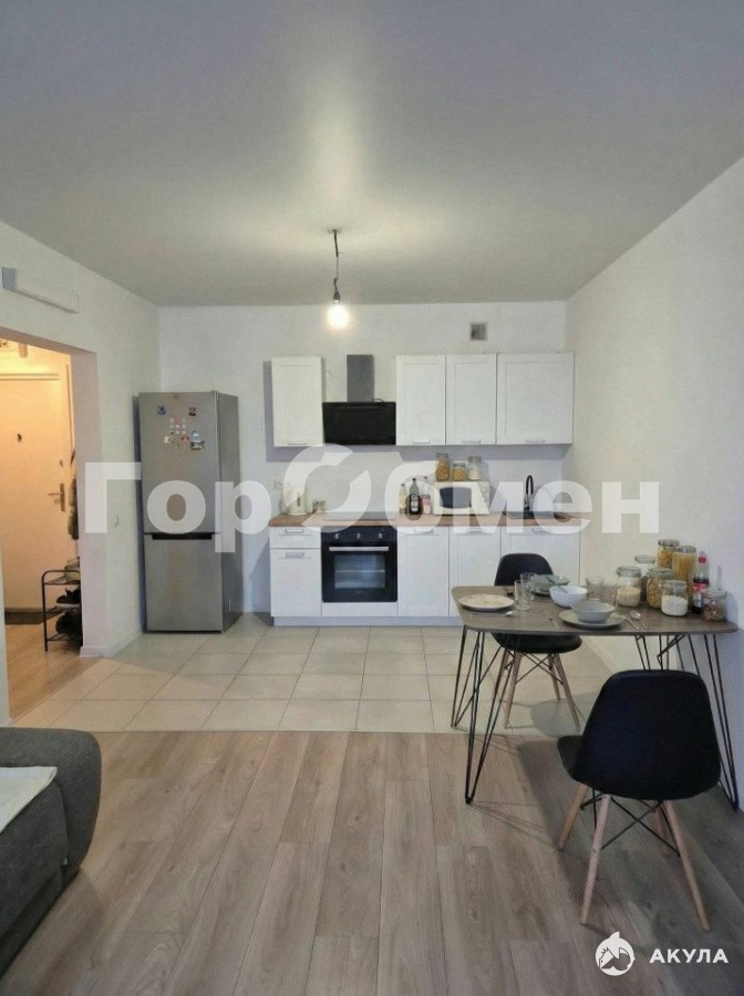 Кухня-гостиная оборудована всей необходимой техникой: кухонный гарнитур, варочная панель, духовка, вытяжка, холодильник и микроволновая печь — всё для вашего удобства. Обеденная зона расположена так, чтобы оставлять больше свободного пространства, делая комнату максимально функциональной и приятной для семейных ужинов или встреч с друзьями.