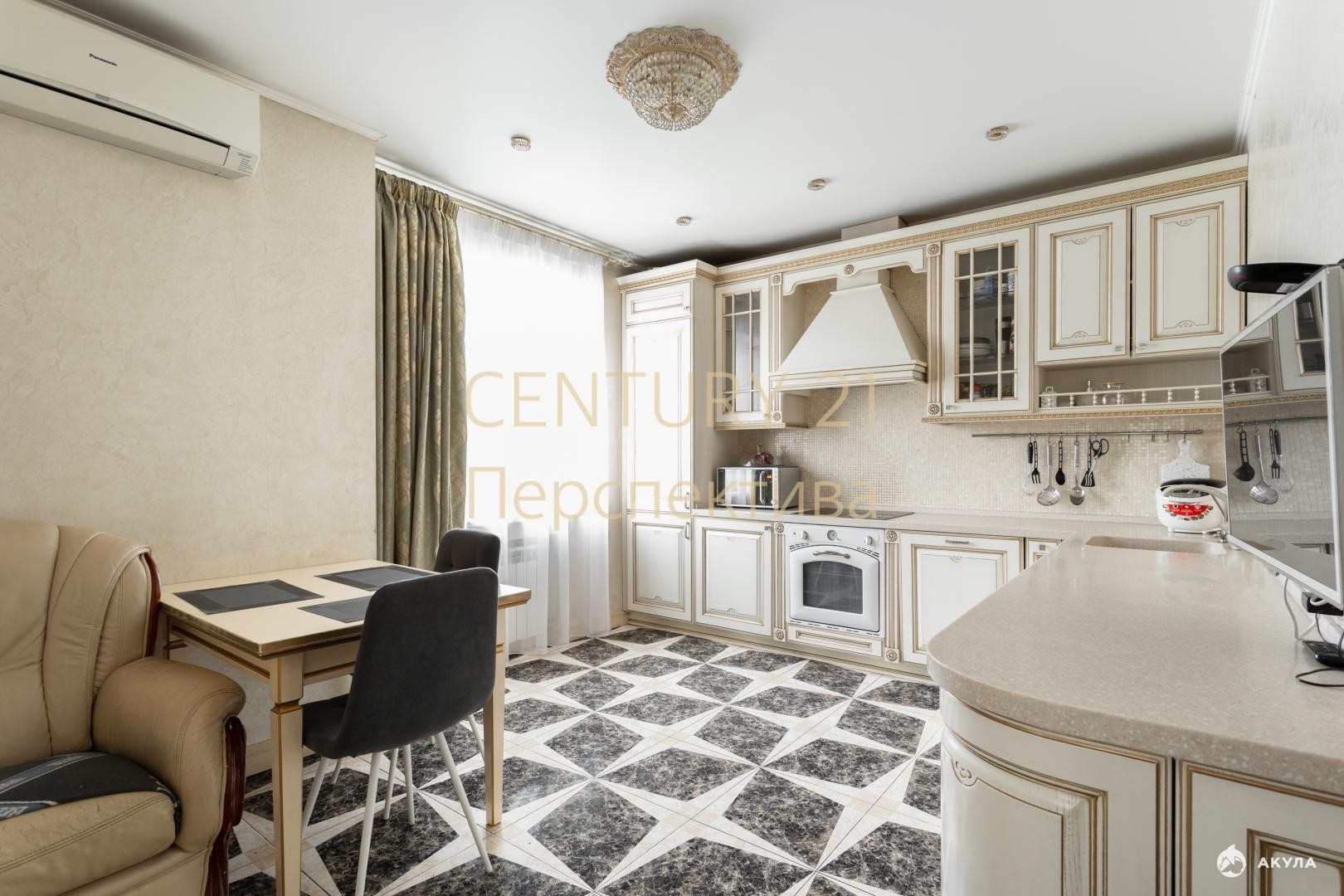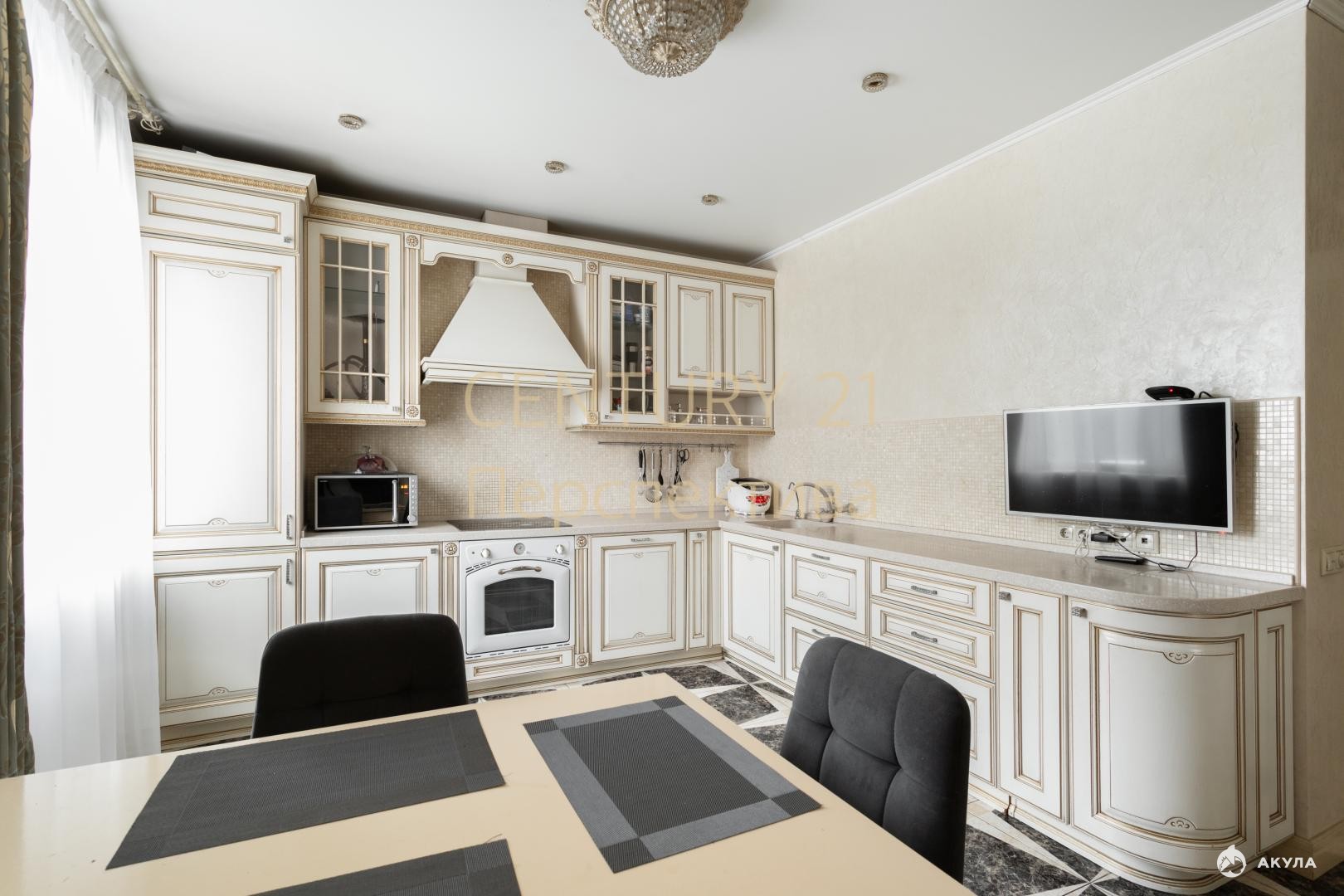 Квартира полностью готова к проживанию. Ремонт выполнен с использованием исключительно дорогостоящих материалов. Мебель, изготовленная на заказ, идеально вписывается в пространство, а массивные белые двери добавляют элегантности.
