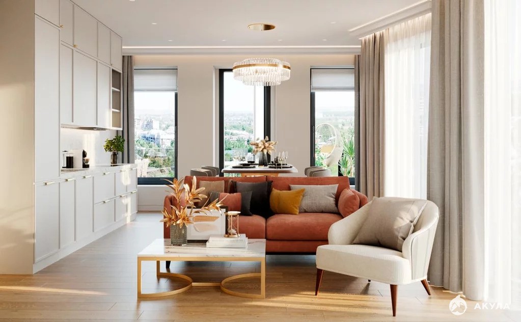 Пощади планировок от студий 20 кв. метров до просторных трехкомнатных апартаментов площадью более 100 кв. метров. Благодаря высоким потолкам и большим панорамным окнам апартаменты наполнены светом и воздухом.