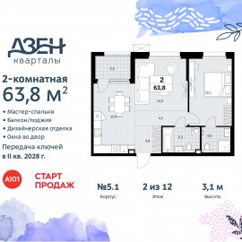 Продается 2-комн. квартира бизнес-класса с европланировкой и отделкой в ЖК "Дзен-кварталы" на 5 этаже. Общая площадь: 60.8 кв.м., жилая: 23.8 кв.м., общая площадь гостиной-столовой с кухонной зоной: 22.8 кв.м. Европланировка, зона гостиной комнаты объединена с кухней. Комнаты...