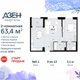 Продается 2-комн. квартира бизнес-класса с европланировкой и отделкой в ЖК "Дзен-кварталы" на 9 этаже. Общая площадь: 63.4 кв.м., жилая: 29.4 кв.м., суммарная площадь гостиной-столовой с кухонной зоной: 29.1 кв.м. Европейская планировка, кухня и гостиная объединены в одно просторное...