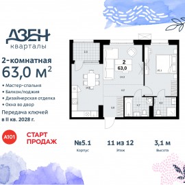 Продается двухкомнатная квартира бизнес-класса с европланировкой и отделкой в ЖК "Дзен-кварталы" на 11 этаже. Общая площадь: 63 кв.м., жилая: 29.4 кв.м., общая площадь гостиной-столовой с кухонной зоной: 28.9 кв.м. Европланировка, кухня-гостиная - идеальный вариант для тех, кто любит...