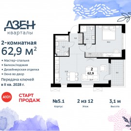 2-комн. квартира бизнес-класса с европланировкой и отделкой в ЖК "Дзен-кварталы" на 2 этаже. Общая площадь: 62.9 кв.м., жилая: 30.8 кв.м., суммарная площадь гостиной-столовой с кухонной зоной: 27 кв.м. Европланировка, зона гостиной комнаты объединена с кухней. Угловая квартира, очень...