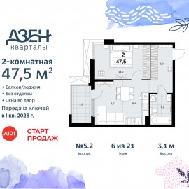 2-комн. квартира бизнес-класса с европланировкой от застройщика в ЖК "Дзен-кварталы" на 13 этаже. Квартира без отделки, после оформления собственности можно делать ремонт. Общая площадь: 47.5 кв.м., жилая: 23.2 кв.м., суммарная площадь гостиной-столовой с кухонной зоной: 17.4 кв.м....