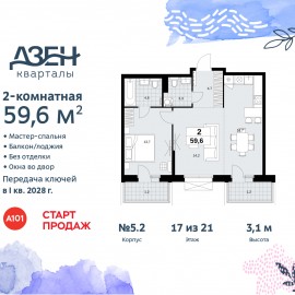 2-комн. квартира бизнес-класса с европланировкой в ЖК "Дзен-кварталы" на 17 этаже. Квартира без отделки, после получения ключей можно делать ремонт. Общая площадь: 59.6 кв.м., жилая: 27.9 кв.м., суммарная площадь гостиной-столовой с кухонной зоной: 30.9 кв.м. Европланировка, за счет...