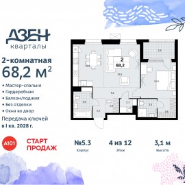 2-комн. квартира бизнес-класса с европланировкой от застройщика в ЖК "Дзен-кварталы" на 4 этаже. Квартира без отделки, после оформления собственности можно делать ремонт. Общая площадь: 68.2 кв.м., жилая: 28.3 кв.м., суммарная площадь гостиной-столовой с кухонной зоной: 28.4 кв.м....
