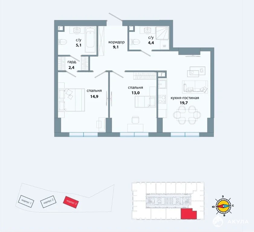- планировка: мастер – спальня с гардеробной и санузлом, детская/кабинет, кухня-гостиная с обеденной зоной, совмещенный санузел, просторный коридор;