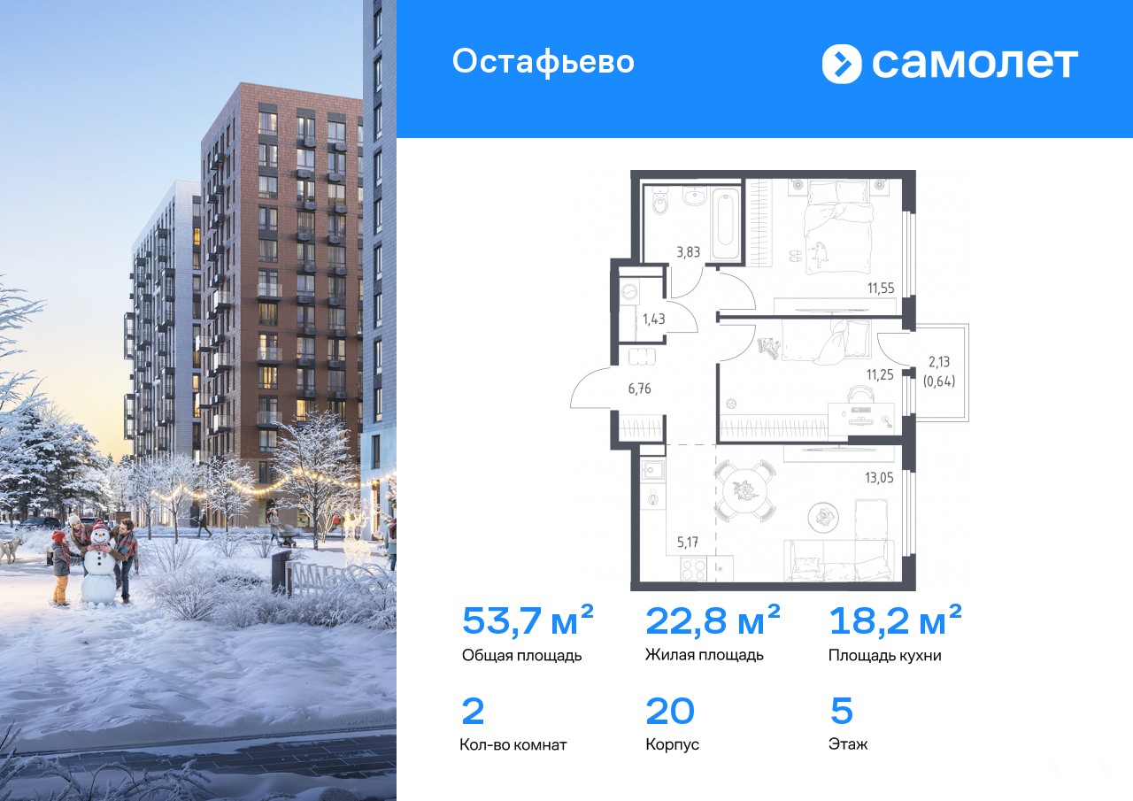 Строим кварталы для жизни с заботой о будущем. Предлагается 2-комнатная квартира комфорт-класса 53, 68 кв.м в корпусе 20 на 5 этаже, в ЖК «Остафьево»