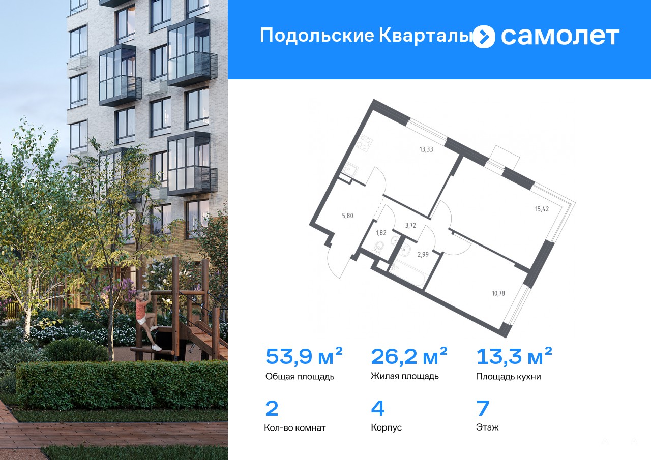 Строим кварталы для жизни с заботой о будущем. Предлагается 2-комнатная квартира комфорт-класса 53, 86 кв.м в корпусе 4 на 7 этаже, в ЖК «Подольские Кварталы»