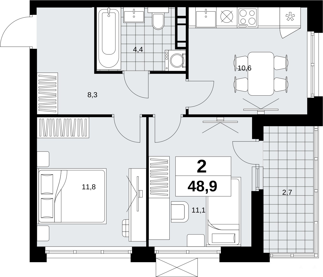 Двухкомнатная квартира в ЖК "Скандинавия" на 11 этаже. Квартира без отделки, после получения ключей можно делать ремонт. Общая площадь: 48.9 кв.м., жилая: 22.9 кв.м., площадь просторной кухни-столовой: 10.6 кв.м. Угловая квартира, очень светлая, естественная вентиляция при открытии окон. В квартире одна лоджия, один совмещенный санузел. Высота потолков 2.95 м.