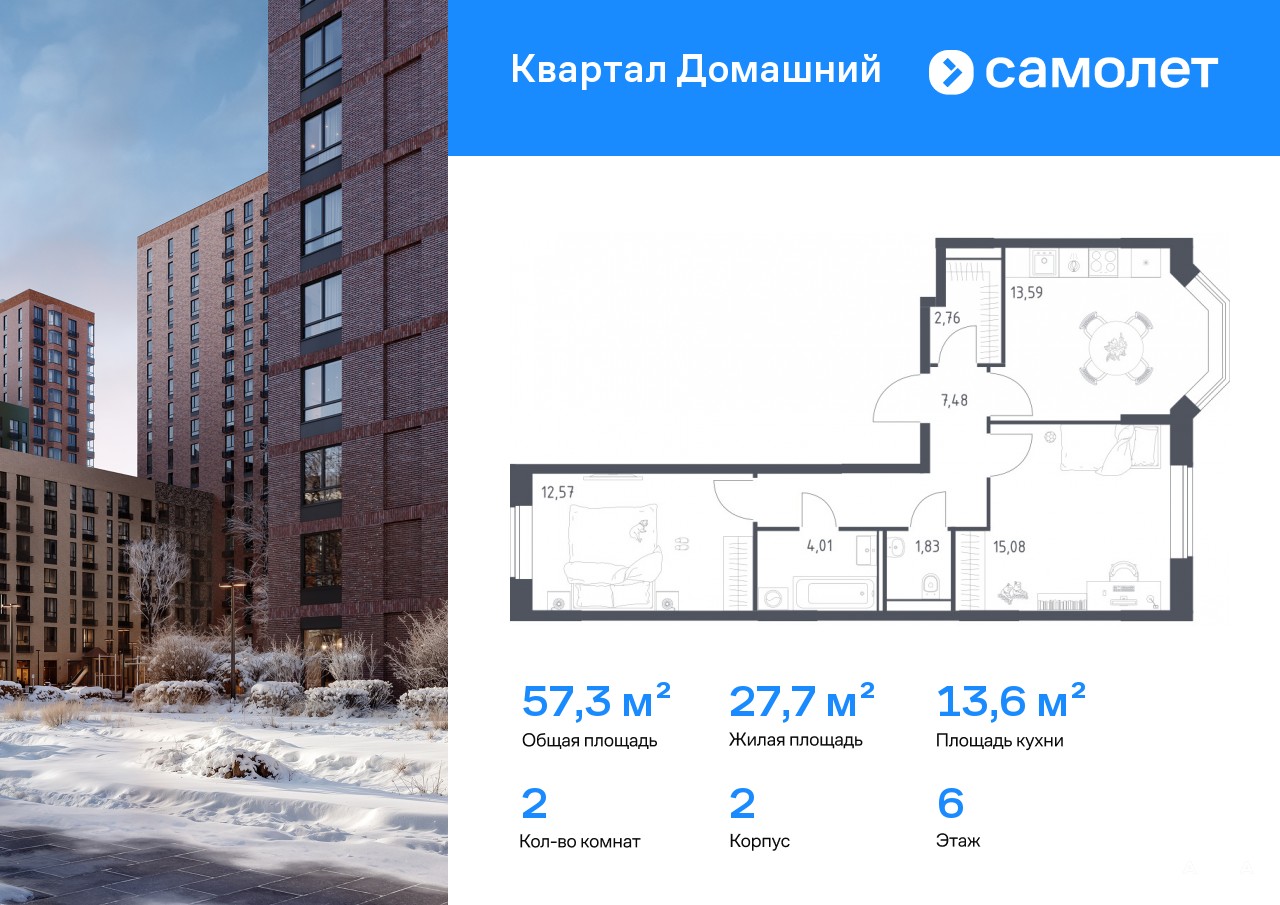 Строим кварталы для жизни с заботой о будущем. Предлагается 2-комнатная квартира комфорт-класса 57, 32 кв.м в корпусе 2 на 6 этаже, в ЖК «Квартал Домашний»