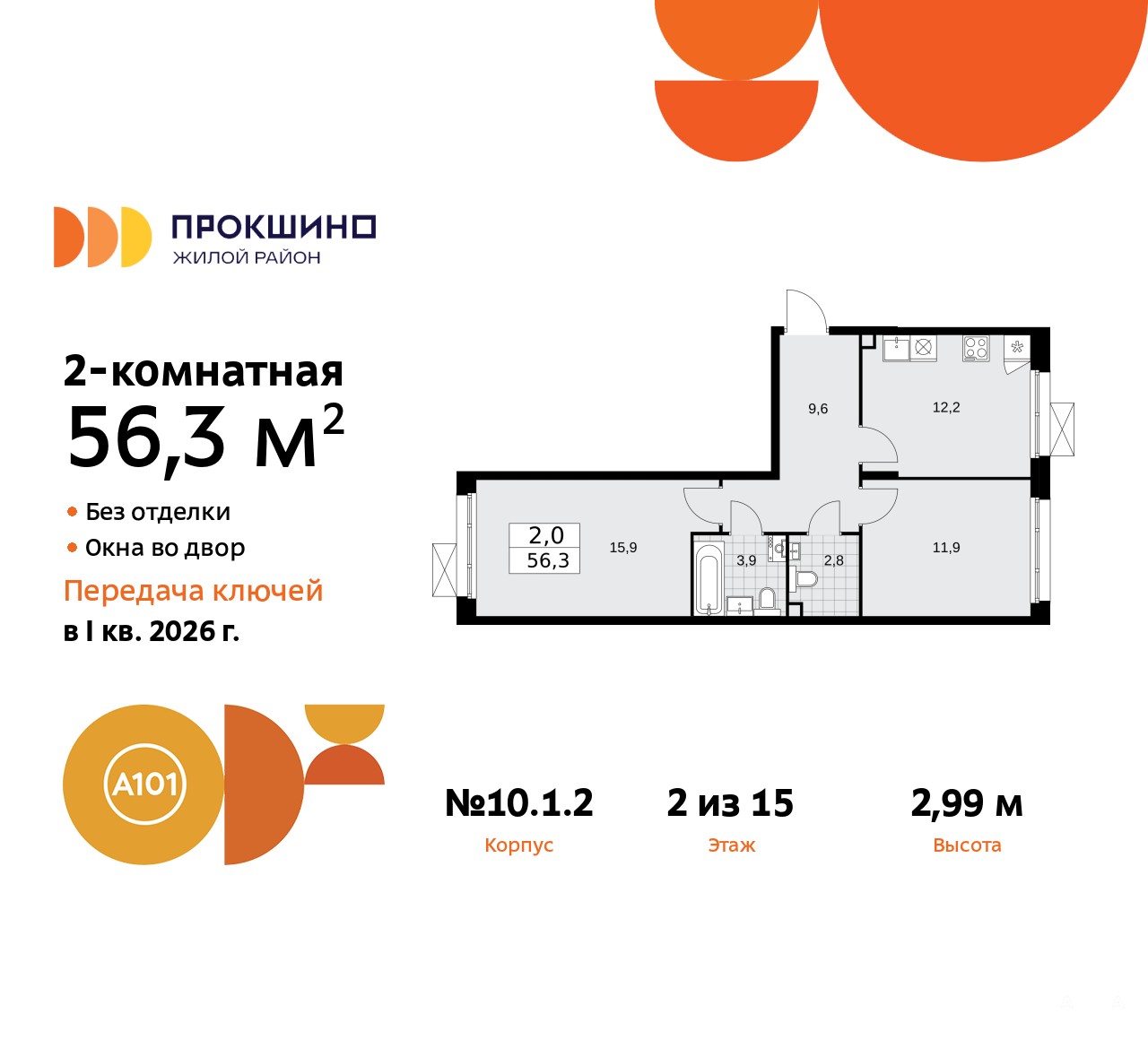 2-комн. квартира в ЖК "Прокшино" на 2 этаже. Квартира без отделки, полностью готова к ремонту. Общая площадь: 56.3 кв.м., жилая: 27.8 кв.м., площадь просторной кухни-столовой: 12.2 кв.м. Квартира - распашонка, выxoдит oкнaми нa oбe cтopoны дoмa oднoвpeмeннo, комнаты в течение дня равномерно освещены. В квартире один совмещенный и один раздельный санузел. Высота потолков 2.99 м.