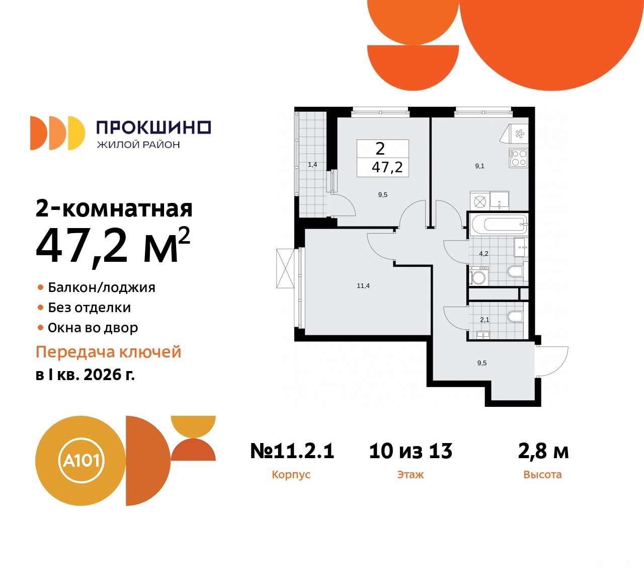 Двухкомнатная квартира в ЖК "Прокшино" на 10 этаже. Квартира без отделки, новый собственник может сделать ремонт по индивидуальному дизайн-проекту. Общая площадь: 47.2 кв.м., жилая: 20.9 кв.м., площадь просторной кухни-столовой: 9.1 кв.м. Квартира угловая, очень светлая, естественная вентиляция при открытии окон. В квартире одна лоджия, один совмещенный и один раздельный санузел. Высота потолков 2.8 м.