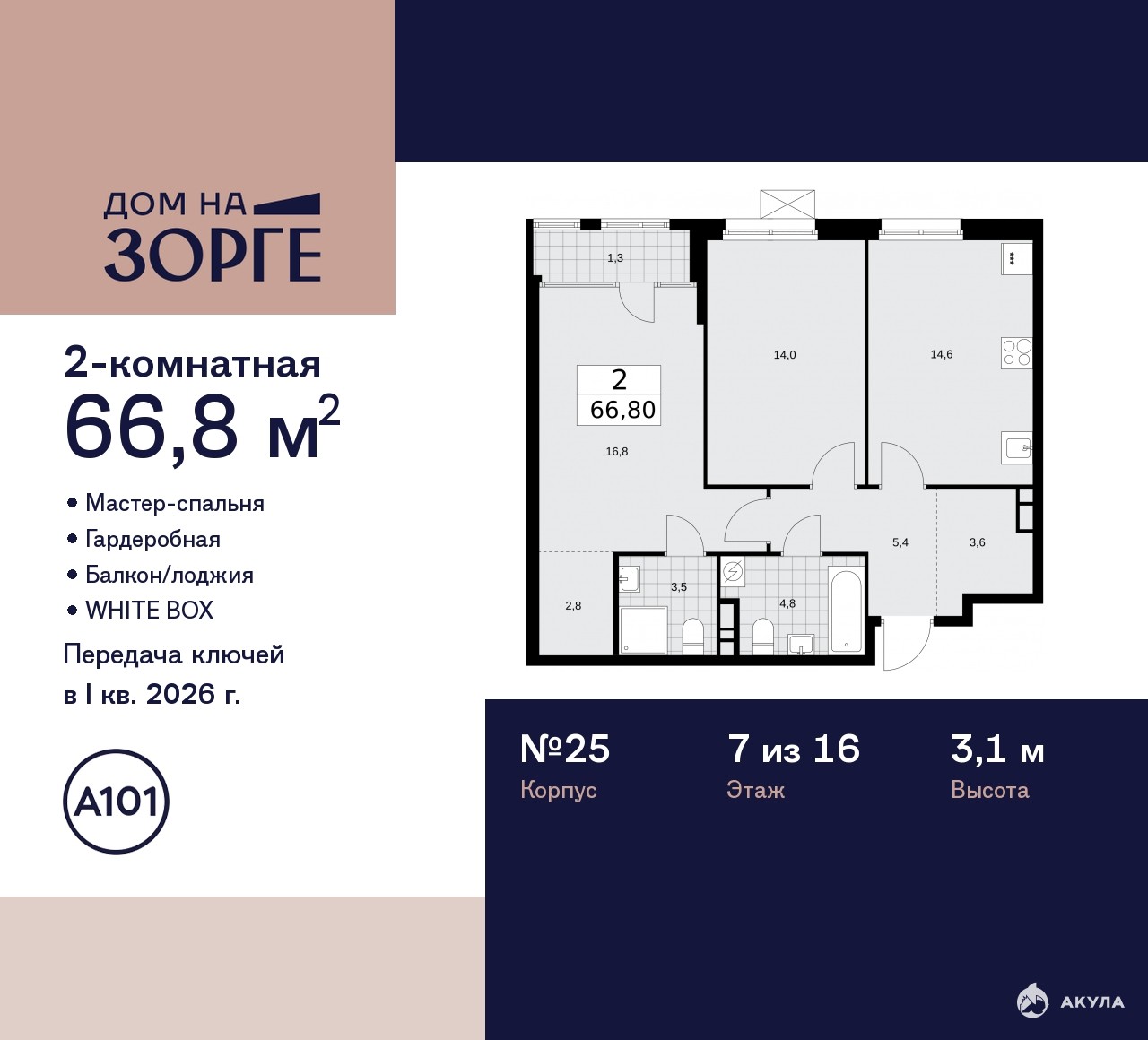 Двухкомнатная квартира от застройщика с предчистовой отделкой в ЖК "Дом на Зорге" на 7 этаже. Общая площадь: 66.8 кв.м., жилая: 30.8 кв.м., площадь просторной кухни-столовой: 14.6 кв.м. Комнаты изолированные, все окна выходят на одну сторону. В квартире одна лоджия, два совмещенных санузла. Высота потолков 3.1 м.