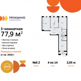 Трехкомнатная квартира от застройщика в ЖК "Прокшино" на 4 этаже. Квартира без отделки, после оформления собственности можно делать ремонт. Общая площадь: 77.9 кв.м., жилая: 40.3 кв.м., площадь просторной кухни-столовой: 15.9 кв.м. Квартира очень светлая, трехсторонняя, планировка...