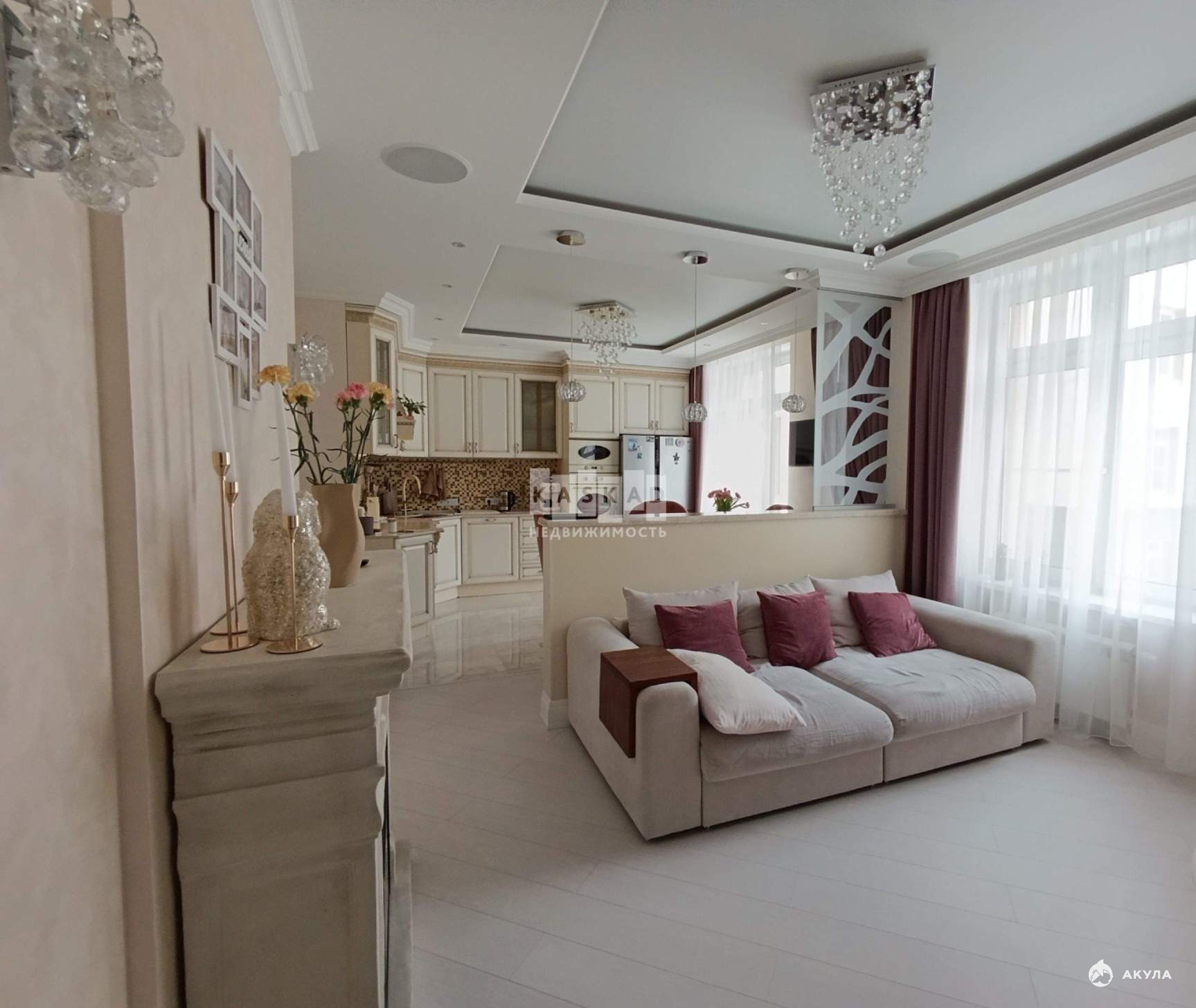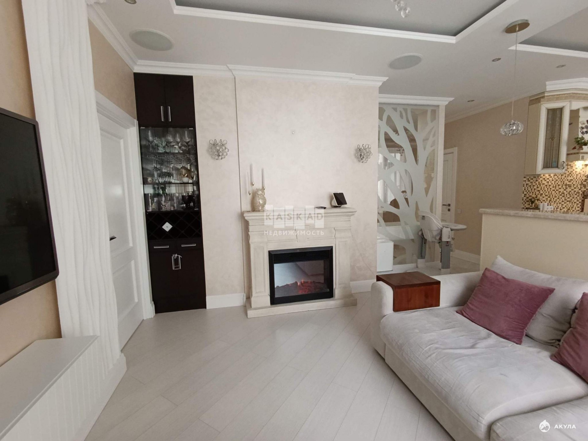 Общая площадь квартиры 84 кв. м. плюс 6 кв. м. застекленная лоджия, которая утеплена и используется как кабинет. Кухня - гостиная разделена на две зоны и оборудована кухонным гарнитуром с техникой, мебелью и камином, спальная комната с гардеробной зоной, детская комната с мебелью и шкафами для хранения вещей, санузел совмещенный с теплым полом, постирочная комната, прихожая со встроенным шкафом.