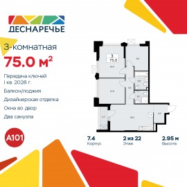 3-комн. квартира с отделкой в ЖК "Деснаречье" на 22 этаже. Общая площадь: 75.2 кв.м., жилая: 35.7 кв.м., площадь просторной кухни-столовой: 20.4 кв.м. Квартира угловая, идеально подойдет любителям тишины и панорамных видов. В квартире одна лоджия, два совмещенных санузла. Высота...
