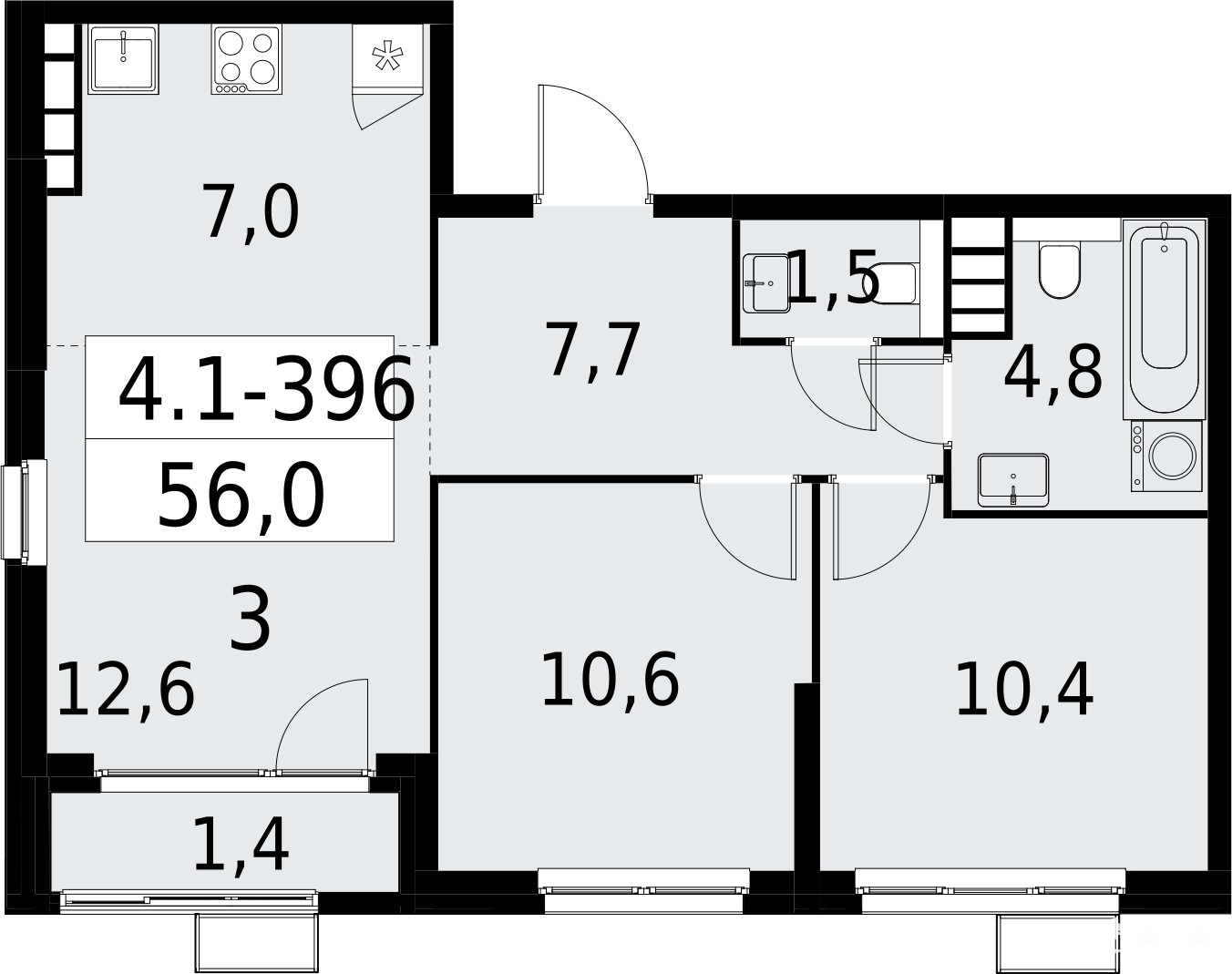 Трехкомнатная квартира с европланировкой и отделкой в ЖК "Южные сады" на 27 этаже. Общая площадь: 56 кв.м., жилая: 33.4 кв.м., общая площадь гостиной-столовой с кухонной зоной: 19.7 кв.м. Европланировка, зона гостиной комнаты объединена с кухней. Комнаты изолированные, все окна выходят на одну сторону. В квартире одна лоджия, один совмещенный и один раздельный санузел. Высота потолков 2.95 м.
