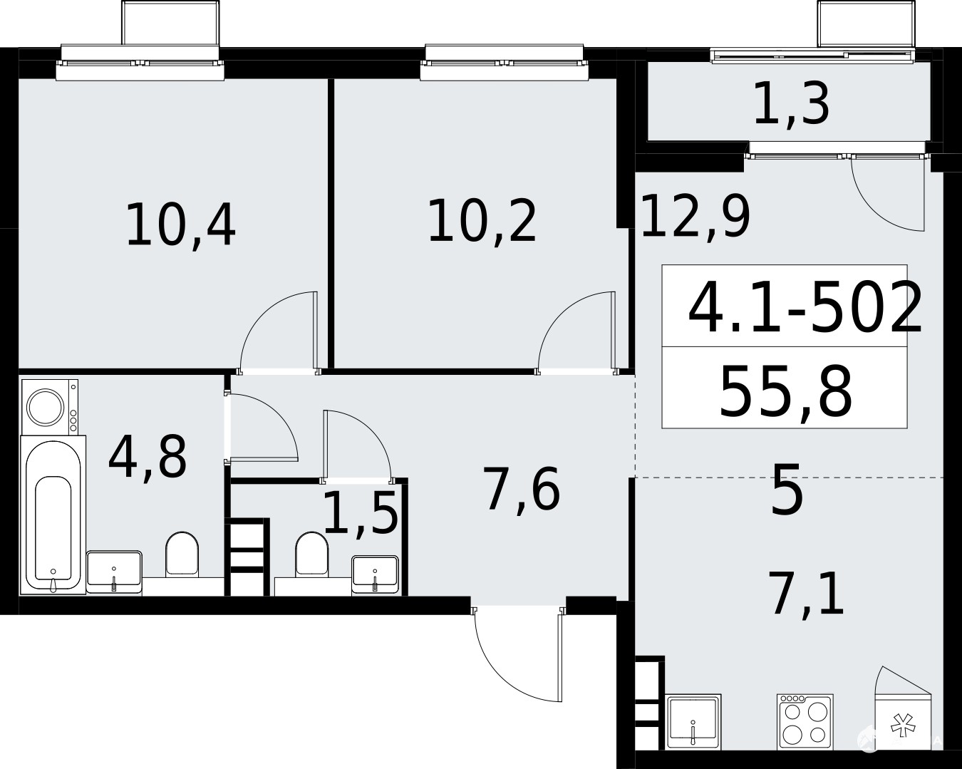 Просторная трехкомнатная квартира с европланировкой и отделкой в ЖК "Южные сады" на 16 этаже. Общая площадь: 55.8 кв.м., жилая: 33.5 кв.м., суммарная площадь гостиной-столовой с кухонной зоной: 20 кв.м. Европейская планировка, кухня и гостиная объединены в одно просторное помещение. Комнаты изолированные, все окна выходят на одну сторону. В квартире одна лоджия, один совмещенный и один раздельный санузел. Высота потолков 2.95 м.