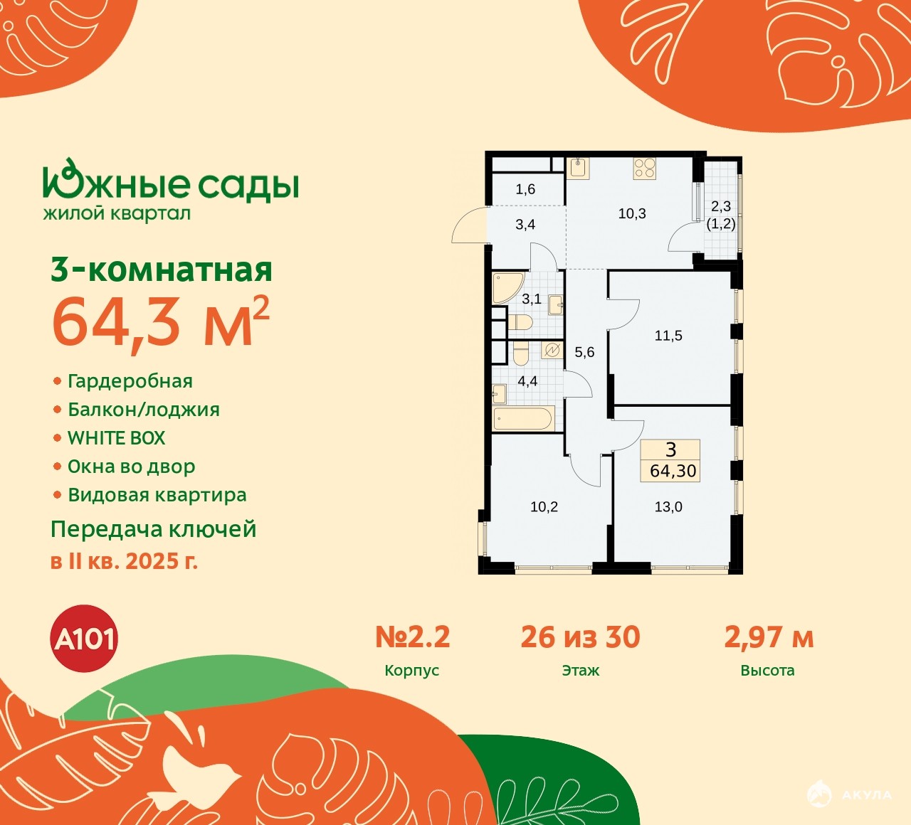 Трехкомнатная квартира с отделкой в ЖК "Южные сады" на 26 этаже. Общая площадь: 64.3 кв.м., жилая: 34.7 кв.м., площадь просторной кухни-столовой: 10.3 кв.м. Угловая квартира, очень светлая, естественная вентиляция при открытии окон. В квартире одна лоджия, два совмещенных санузла. Высота потолков 2.87 м.