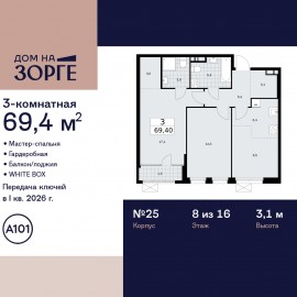 Просторная 3-комн. квартира с европланировкой и предчистовой отделкой в ЖК "Дом на Зорге" на 8 этаже. Общая площадь: 69.4 кв.м., жилая: 43.9 кв.м., общая площадь гостиной-столовой с кухонной зоной: 14.9 кв.м. Европейская планировка, за счет большой площади кухни-гостиной квартира...