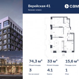 Строим кварталы для жизни с заботой о будущем. Предлагается 3-комнатная квартира бизнес-класса 74, 33 кв.м в корпусе 4.1 на 1 этаже, в «Верейская 41» Квартира без отделки. Доступность опции «отделка» и возможность комплектации мебелью и декором уточняйте у...