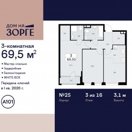 Продается трехкомнатная квартира с европланировкой и предчистовой отделкой в ЖК "Дом на Зорге" на 3 этаже. Общая площадь: 69.5 кв.м., жилая: 43.9 кв.м., суммарная площадь гостиной-столовой с кухонной зоной: 14.9 кв.м. Европейская планировка, кухня-гостиная - идеальный вариант для тех,...