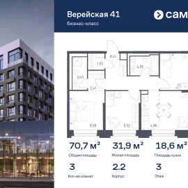 Строим кварталы для жизни с заботой о будущем. Предлагается 3-комнатная квартира бизнес-класса 70, 67 кв.м в корпусе 2.2 на 3 этаже, в «Верейская 41» Квартира без отделки. Доступность опции «отделка» и возможность комплектации мебелью и декором уточняйте у...