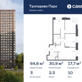Строим кварталы для жизни с заботой о будущем. Предлагаются 3-комнатные апартаменты бизнес-класса 64, 61 кв.м в корпусе 2.3 на 10 этаже, в МФК «Тропарево Парк» Апартаменты с чистовой отделкой. Доступность дополнительных опций уточняйте у застройщика. Прописка не предусмотрена...