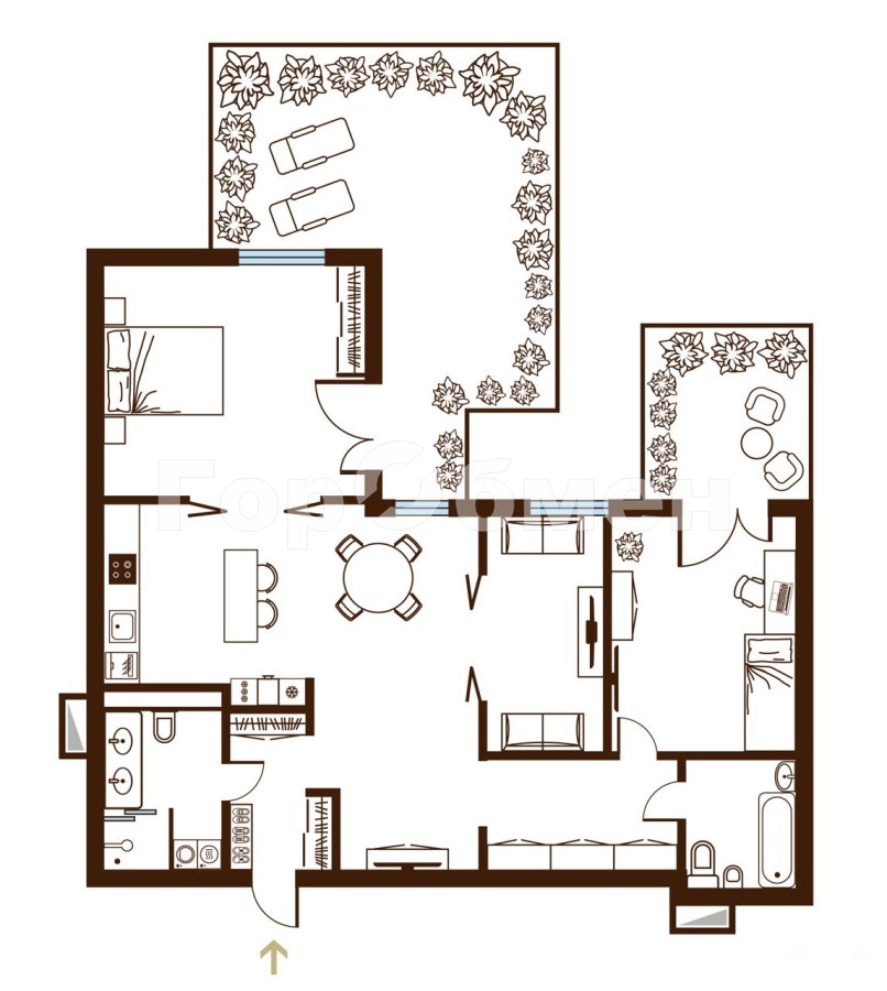 Квартира расположена на 5 этаже и имеет два выхода на огороженные террасы площадью 40 м² и 10 м². Террасы оборудованы электро- и водоснабжением, что делает их идеальным местом для отдыха. Общая площадь с террасами составляет 144 м².