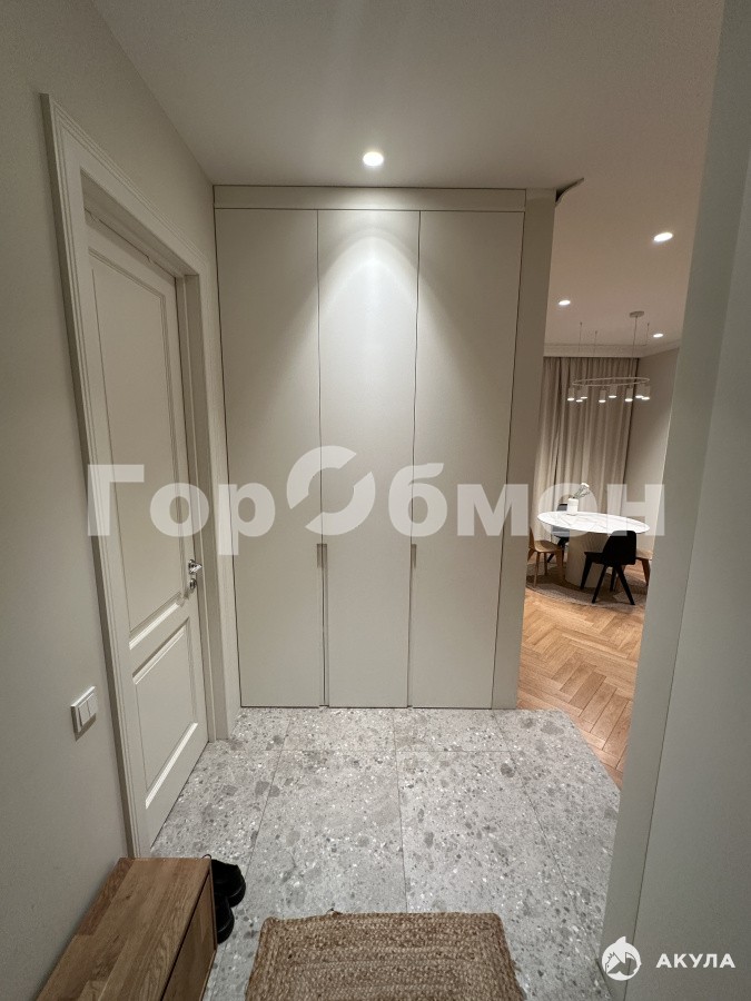 Планировка выполнена в европейском стиле: просторная кухня-гостиная (40 м²) позволяет комфортно разместить более 20 человек. Анфиладное расположение комнат и полнораспашные четырехстворчатые двери из массива дают возможность объединить пространство в единую зону. Высота потолков составляет честные 3 метра. На полу - дубовый паркет. Встроенная мебель предусмотрена в прихожей, коридоре и санузлах. Коридор организован как отдельная гардеробная.