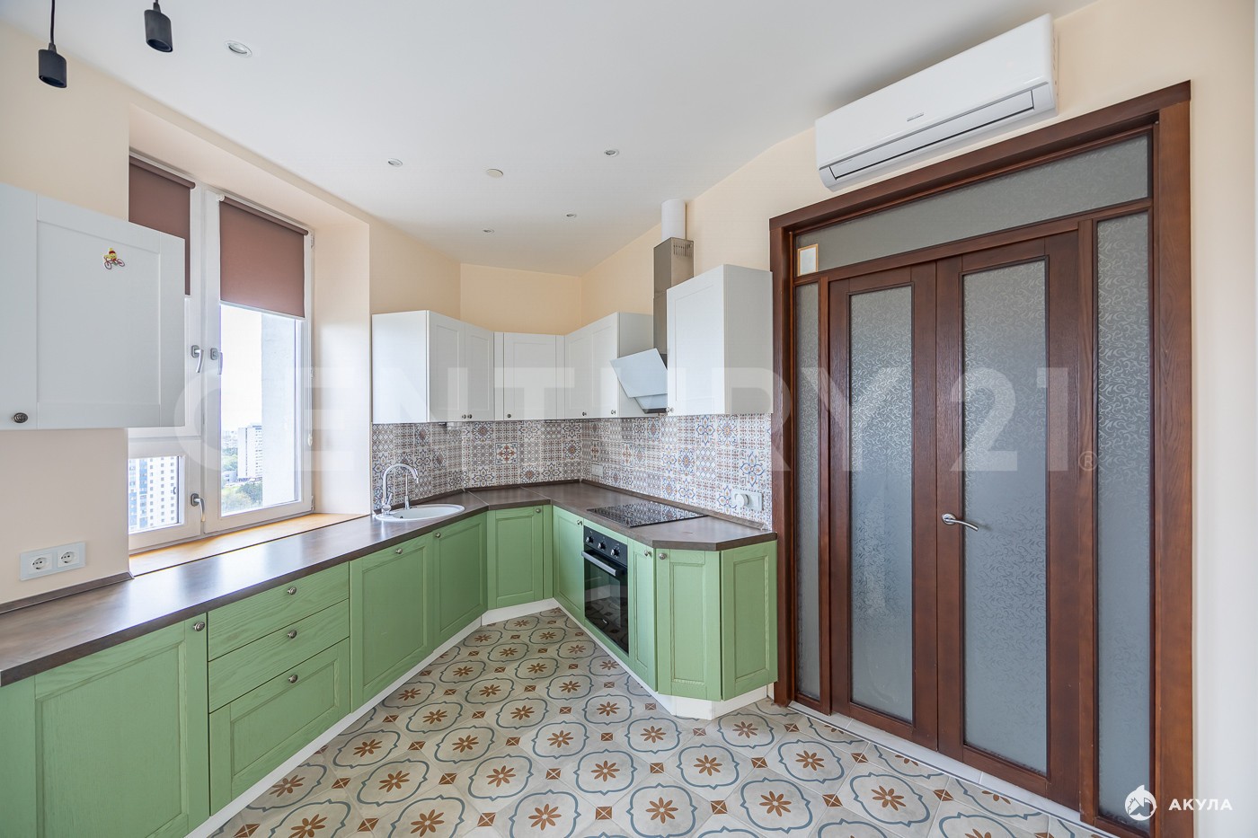 Встроенная современная кухня с бытовой техникой остаются. Сделан качественный евро ремонт из импортных материалов.