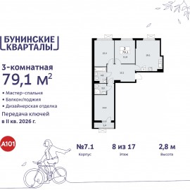 Продается 3-комн. квартира от застройщика с отделкой в ЖК "Бунинские кварталы" на 8 этаже. Общая площадь: 79.1 кв.м., жилая: 38.6 кв.м., площадь просторной кухни-столовой: 19.1 кв.м. Квартира - распашонка, без проходных комнат, окна выходят на paзные стороны дома. В квартире один балкон,...