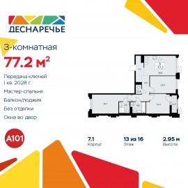 Продается 3-комн. квартира в ЖК "Деснаречье" на 13 этаже. Квартира без отделки, новый собственник может сделать ремонт по своему проекту. Общая площадь: 77.2 кв.м., жилая: 38.9 кв.м., площадь просторной кухни-столовой: 16.6 кв.м. Квартира - распашонка, без проходных комнат, окна выходят...