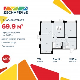 Просторная трехкомнатная квартира с отделкой в ЖК "Деснаречье" на 14 этаже. Общая площадь: 75.2 кв.м., жилая: 35.7 кв.м., площадь просторной кухни-столовой: 20.4 кв.м. Квартира угловая, окна oбecпeчивaют paвнoмepнoe ocвeщeниe в тeчeниe дня. В квартире одна лоджия, два совмещенных санузла. Высота...