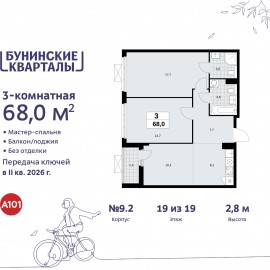Просторная 3-комн. квартира с европланировкой в ЖК "Бунинские кварталы" на 19 этаже. Квартира без отделки, полностью готова к чистовой отделке и дальнейшему ремонту. Общая площадь: 68 кв.м., жилая: 42.6 кв.м., суммарная площадь гостиной-столовой с кухонной зоной: 18.3 кв.м....