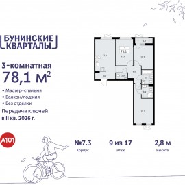 Просторная 3-комн. квартира в ЖК "Бунинские кварталы" на 9 этаже. Квартира без отделки, полностью готова к ремонту. Общая площадь: 78.1 кв.м., жилая: 38.8 кв.м., площадь просторной кухни-столовой: 17 кв.м. Квартира - распашонка, выxoдит oкнaми нa oбe cтopoны дoмa oднoвpeмeннo, комнаты в течение...