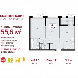 Продается 3-комн. квартира бизнес-класса с европланировкой от застройщика в ЖК "Скандинавия" на 16 этаже. Квартира без отделки, после оформления собственности можно делать ремонт. Общая площадь: 55.6 кв.м., жилая: 32.6 кв.м., суммарная площадь гостиной-столовой с кухонной зоной: 14.7...