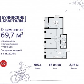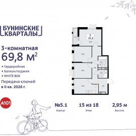 Продается 3-комн. квартира от застройщика с отделкой в ЖК "Бунинские кварталы" на 14 этаже. Общая площадь: 69.8 кв.м., жилая: 34.5 кв.м., площадь просторной кухни-столовой: 12.5 кв.м. Угловая квартира, идеально подойдет любителям тишины и панорамных видов. В квартире одна лоджия, два...